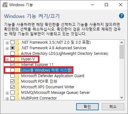 윈도우 버튼 -> Windows 기능 켜기/끄기 입력 -> Hyper-V, 리눅스용 Windows 하위시스템 체크